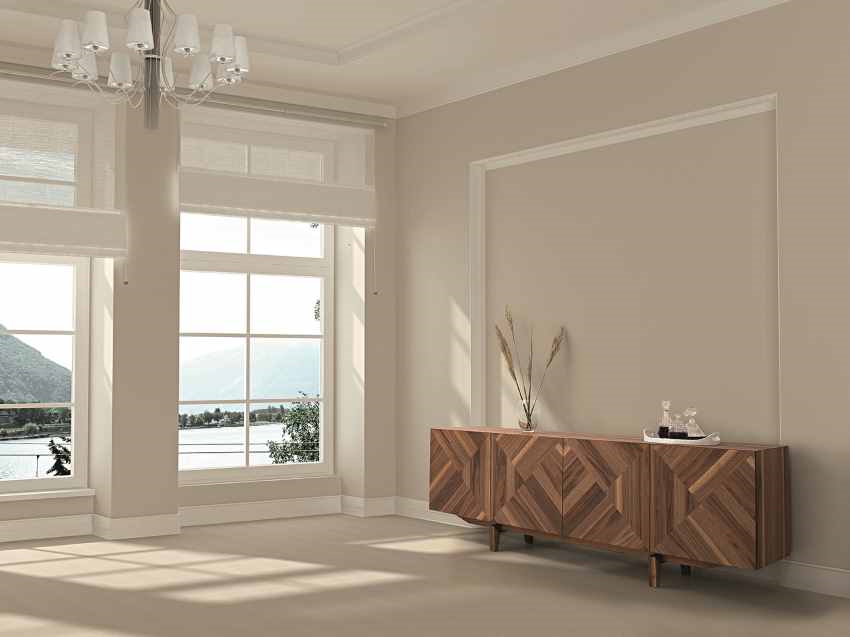 Μπουφές Gill μινιμαλιστικού σχεδιασμού από ξύλο καρυδιάς με ιδιαίτερα εντυπωσιακές πόρτες σε σχήμα ”ψαροκόκκαλου” και διαστάσεις 240X47X80 εκ.